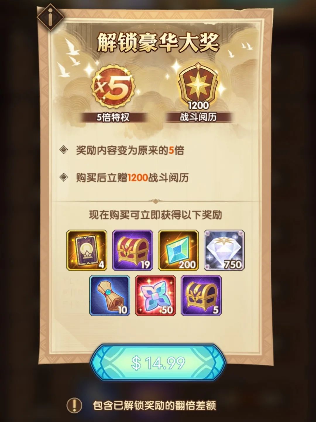 3.购买解锁历练之途豪华大奖可以让所有奖励变为原来的5倍,同时还将附赠1200战斗阅历。