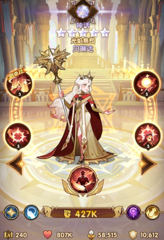 SP光女受到来自友军的属性增益与能量回复效果提升;且每次受到友军的能量回复效果时,都会对友军回馈施加辉煌圣焰,buff持续期间其主动技能会触发次级技能,对目标及其周围的敌人造成伤害;每累计释放4次回馈,SP光女将进入或延长“圣焰”状态5S,且自身神圣伤害永久提升2%。