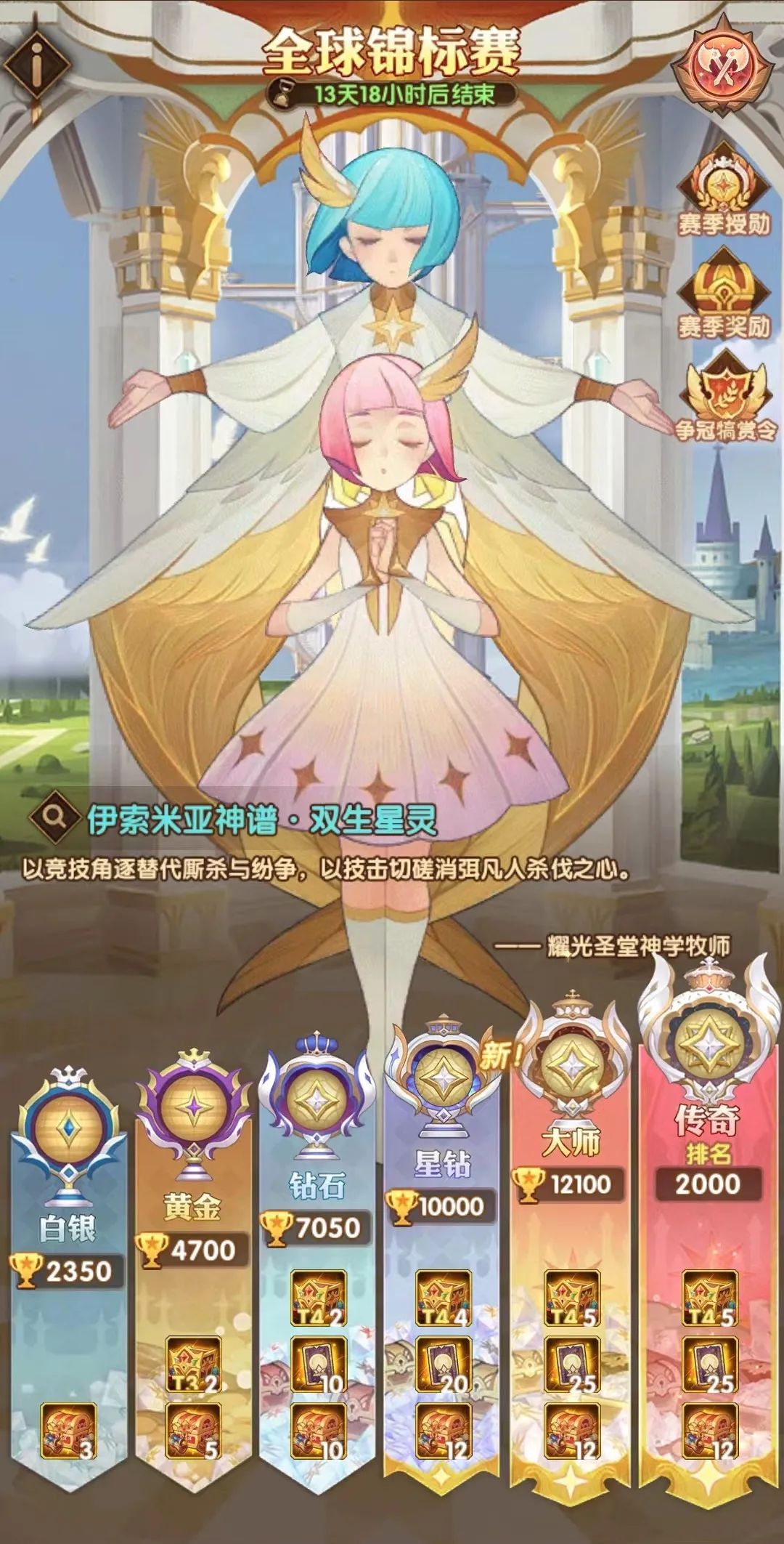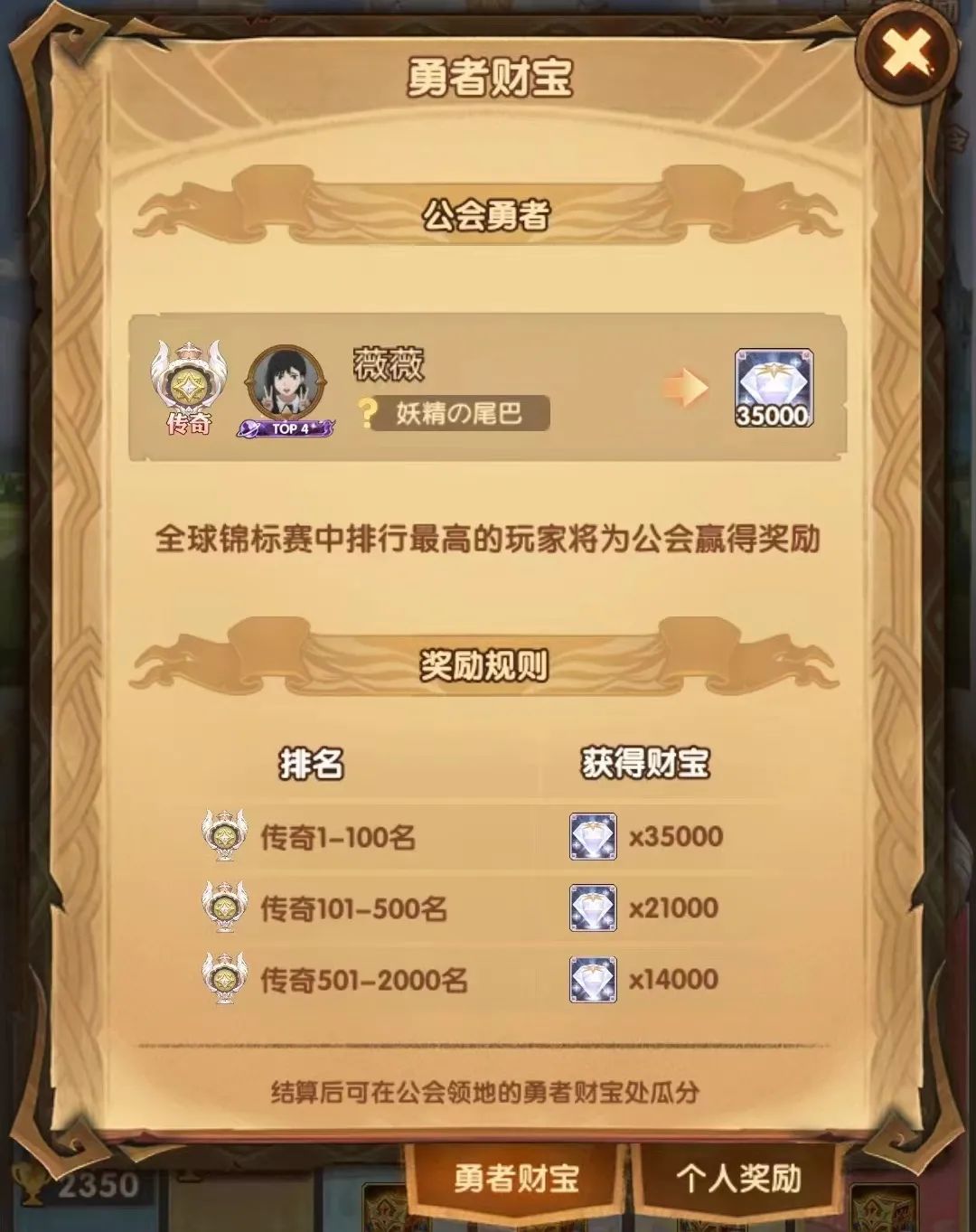 14.玩家在全球锦标赛总榜排名前2000,在赛季结算后将获得包含大量钻石的财宝,一个赛季每个公会最多获得一份财宝,一个公会有多名玩家时取最高名次者为准。