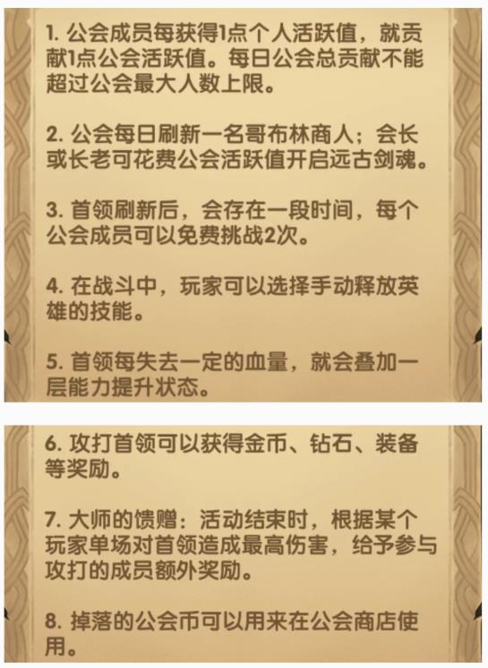 加入公会后即可,开启公会狩猎,公会狩猎是获取公会币&金币的主要途径,公会狩猎目前一共2个BOSS,哥布林商人 & 远古剑魂