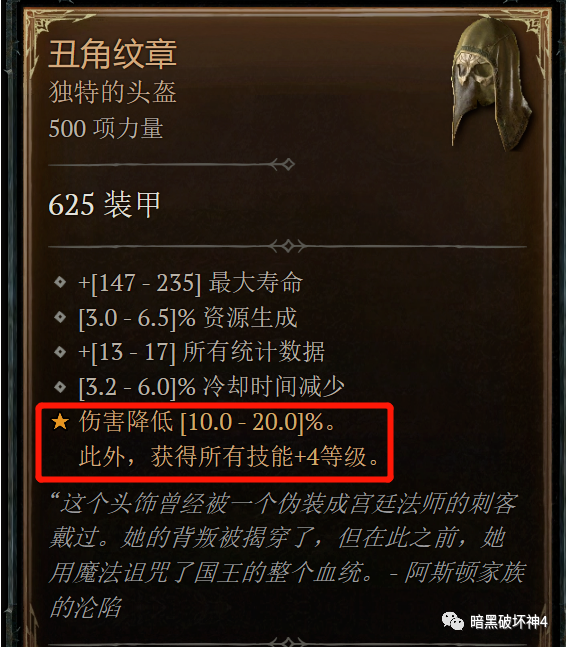 军帽是暗黑4最强大的暗金装备,全技能+4的逆天属性,一条词缀相当于其他全部装备加起来的效果。