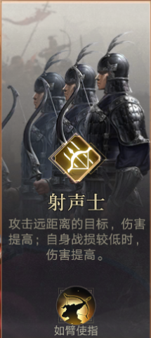 最推荐大家搭配的是射声士,因为射声士纯粹的输出型兵种,包含智力和武力输出两种类别的输出方向。战法选择如臂指使,如果对面有闪避类武将,可以选择晦夜射声。