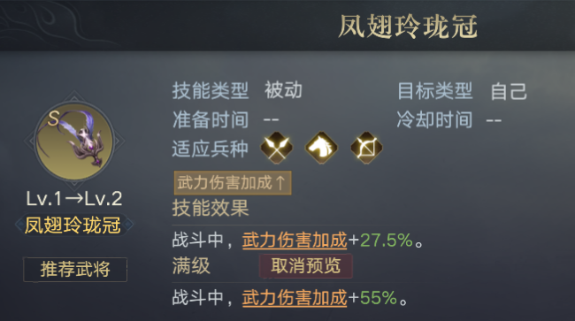 战斗中,武力伤害加成增加27.5%-55%(满级)。