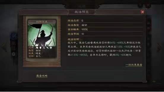 主将张辽其自带战法陷阵突袭,战斗中有68%几率锁定敌方主将,提高自身突击战法发动几率,成功发动突击战法后再次对攻击目标造成一次兵刃伤害,身为主将时获得6%倒戈效果。