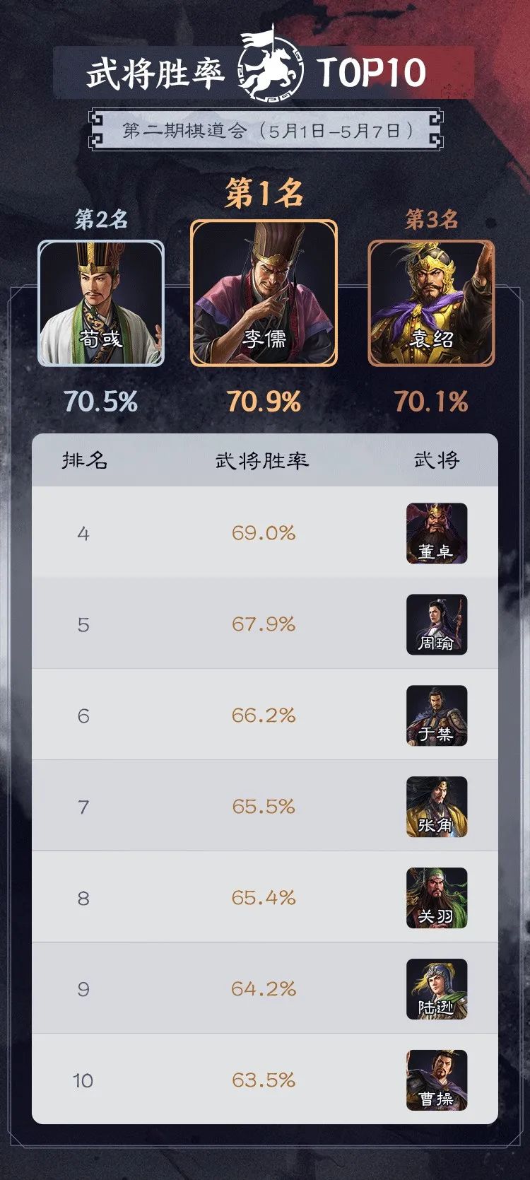 此外,榜单的第二名也出人意料,居然是吴国的“吴刀”,因孙坚其强力的嘲讽和控制combo加上太史慈的高频攻击,让“吴刀”在本次棋道会中大放异彩,虽然出场次数不多,但着实称得上是“常胜将军”。