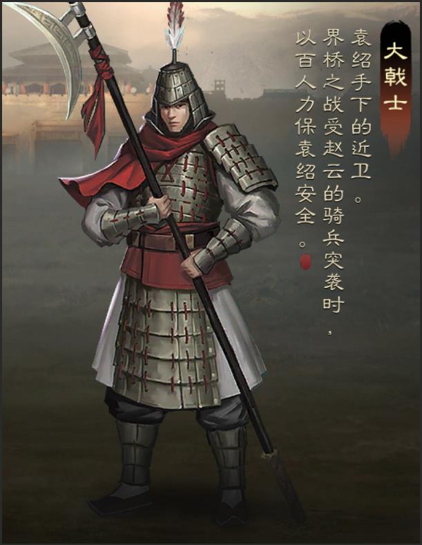 历史上大戟士是袁绍帐下重装步兵,统率为张郃,士兵百里挑一,全员配备大戟和重甲,简直可以说是坦克一般的存在,一个队伍就实现了现代战争步坦协同的意义。