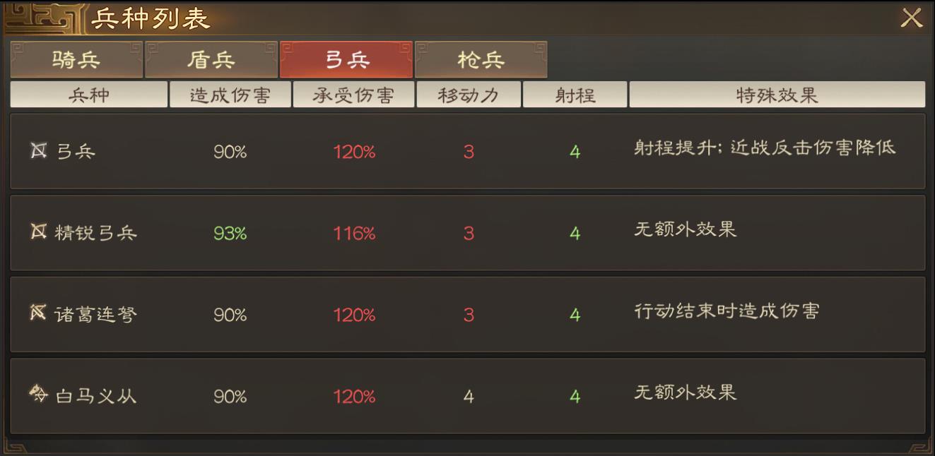 【弓兵高级兵种】弓兵特殊兵种有三类,分别是:<白马从义>、<诸葛连弩>和<精锐弓兵>。