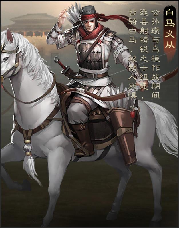 历史上,白马义从是由公孙瓒组建的弓骑兵,《后汉书》记载:瓒常与善射之士数十人,皆乘白马,以为左右翼,自号“白马从义”。值得提到的是,有野史记载赵云原是白马从义之一,由此可见,这支弓骑兵人数虽少但个个精锐。