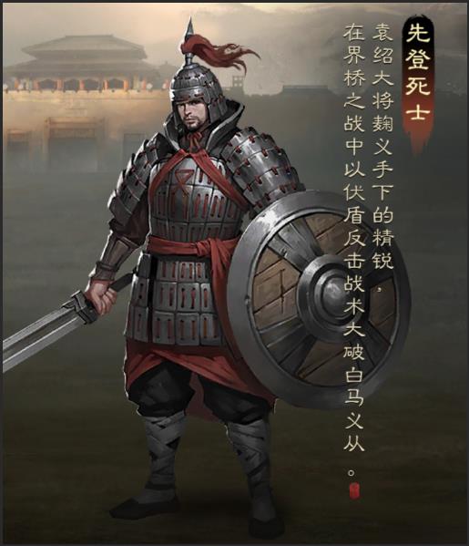 先登死士可是当年击败“白马从义”的悍卒,据说只有八百人,统率是袁绍旗下麹义,正是他们在界桥之战以盾克弓骑,取得大胜。这是轻骑兵的真正克星。