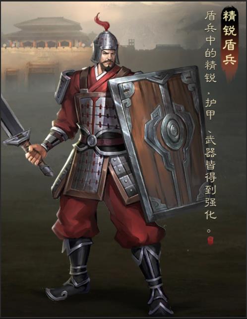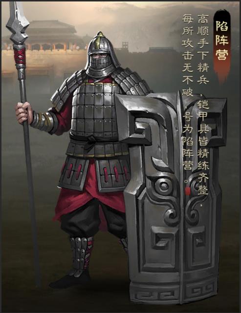 【盾兵高级兵种】盾兵高级兵种同样也有三类,分别是:<陷阵营>、<先登死士>和<精锐盾兵>。