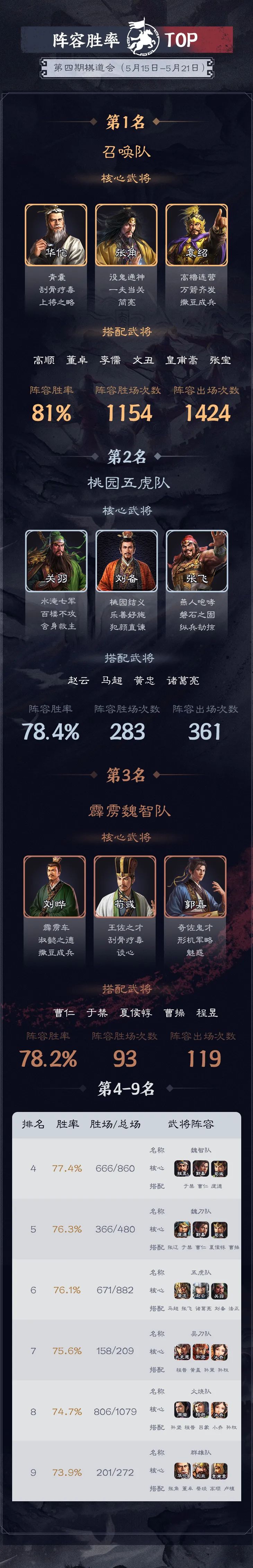 此外,本期榜单中,阿棋将胜率前三名的阵容,使用频率最高的战法做了汇总,希望能给主公们在后续的棋道会之争中起到一定的帮助。欢迎各位主公前来“抄作业”!