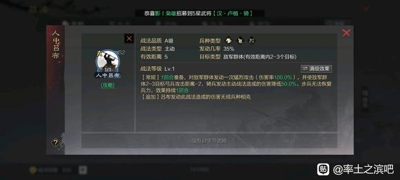 弓兵(弓骑也行)限定,伤害率低,而且发动率也只有35,需要拆弓吕或者汉董,垃圾。