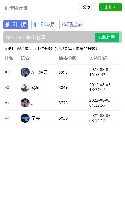 积分规则每50抽统计一次分数进行排行榜,排行榜积分只保留最高一次。