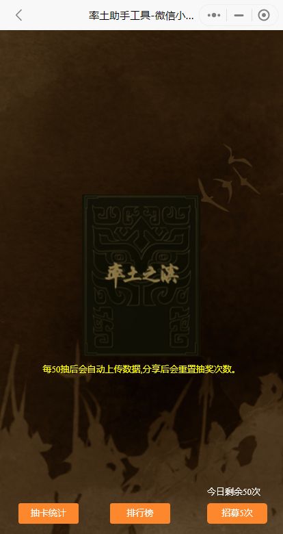 率土助手工具》游戏的抽卡模拟工具,每完成50抽后将根据规则统计分数,分数积分将会进入排行榜,后续还会陆续开设抽卡排行活动。