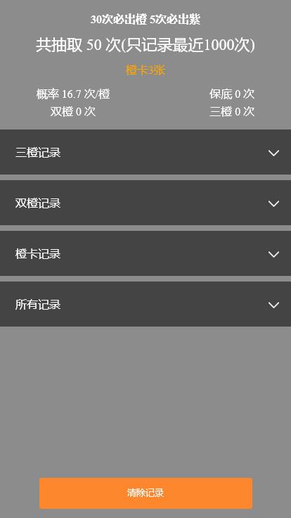 抽奖记录查看最近1000次的抽奖记录统计,可以看到出橙概率,保底次数,双橙次数,三橙次数。